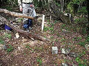 三角点を中心にして南北三㍍、東西二・五㍍位の自然林の広場になっており、展望は全く利かない。早速付近の清掃をする。少し西に行くとヌタ場のような所がある。後で判った事だが、ここからさらに薮を西に行くと展望が開けている場所があったかも知れない。これは帰途、仁淀川左岸の鉄道鉄橋付近から山容を見上げた時に気づいたものである。